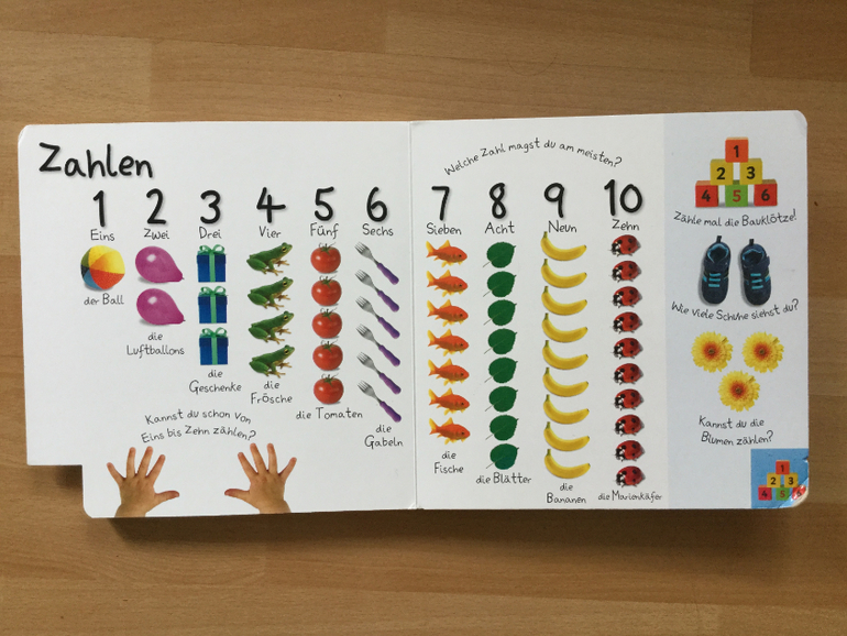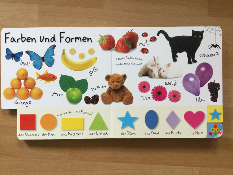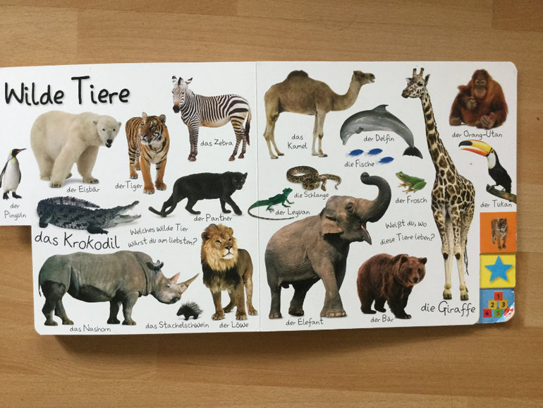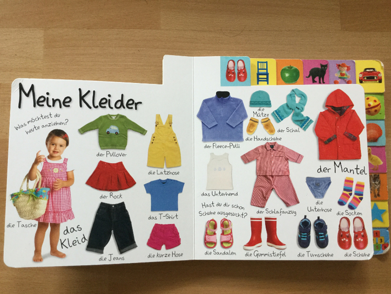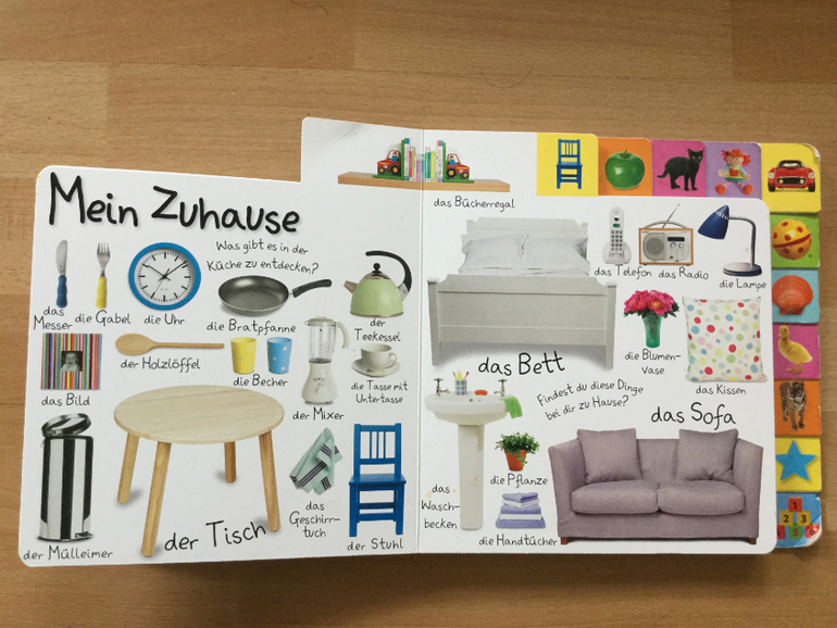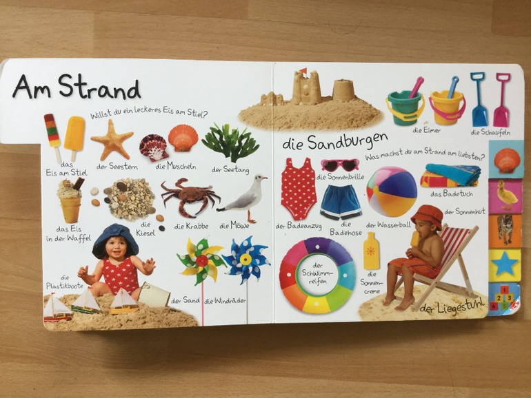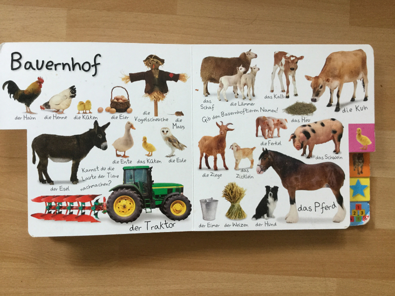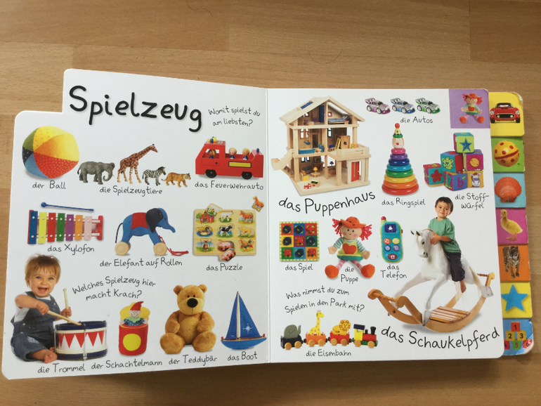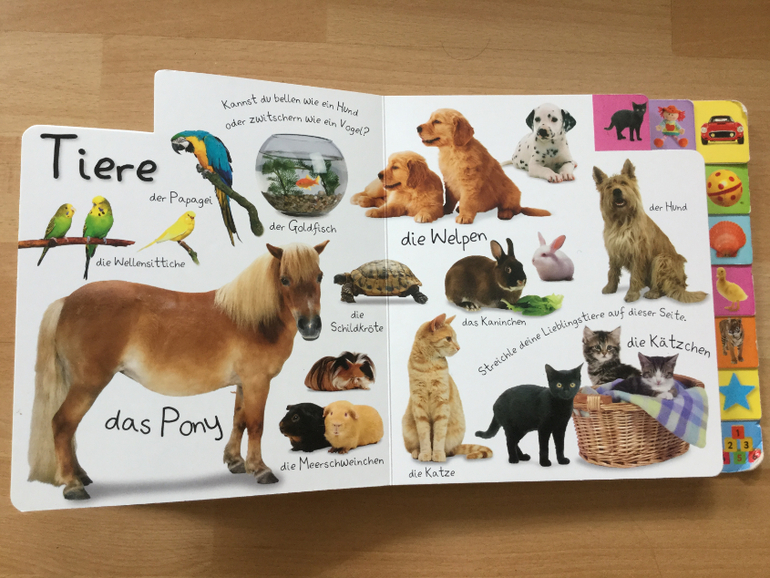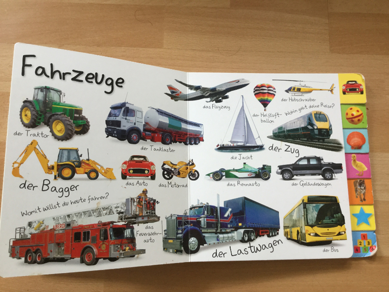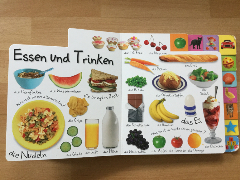 А затем в 1г3 мес у нас появилась вот эта чудесная книжка - словарь, которая сразу завоевала очень большой интерес у ребёнка, до сих пор Тамара приносит мне эту книжку посмотреть почти каждый день. Фотографическое качество изображений позволяет ребёнку сразу узнавать предметы обихода, а с другой стороны подвигло меня показать дочке например многие незнакомые ей фрукты и овощи вживую - поставив рядом с книжкой из разглядывать было особенно интересно. Страничка с дикими животными была долго любимой - быстро запомнила там всех животных, сейчас в почёте разворот с машинками (1г9мес). Ещё одно - качество немецких книг-картонок для детей ни в какое сравнение с большинством наших не идёт - картон похож на пластик и практически неубиваем. Пока мне такого качества попадалась из наших только Маршак Где обедал воробей.