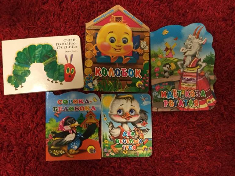 Мы начали с книжек-картонок, которые нам привезли из России, а потом у нас появилась Гусеница, но особо не пошла - играли даже с тестом, просовывали "гусениц" в дырочки - в разряд любимых книжка точно не попала.
