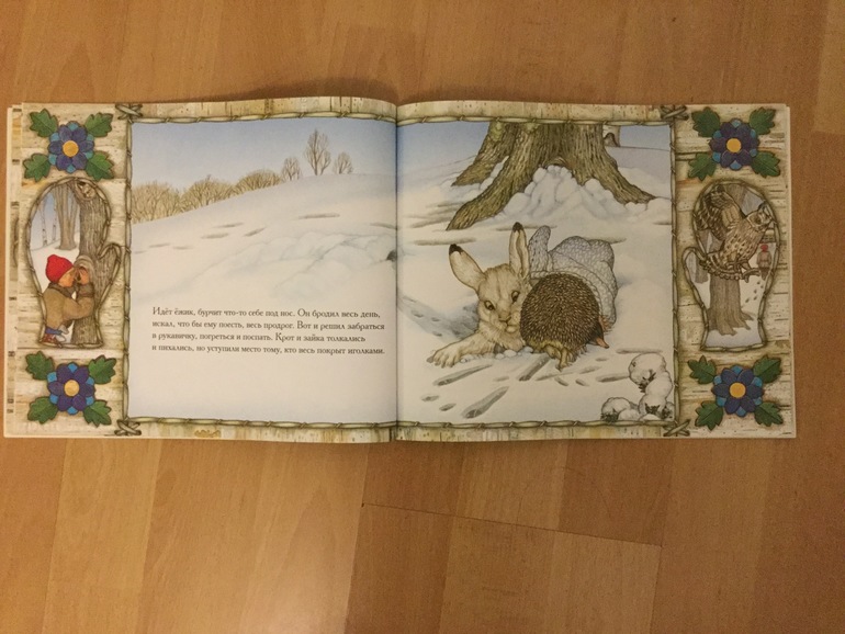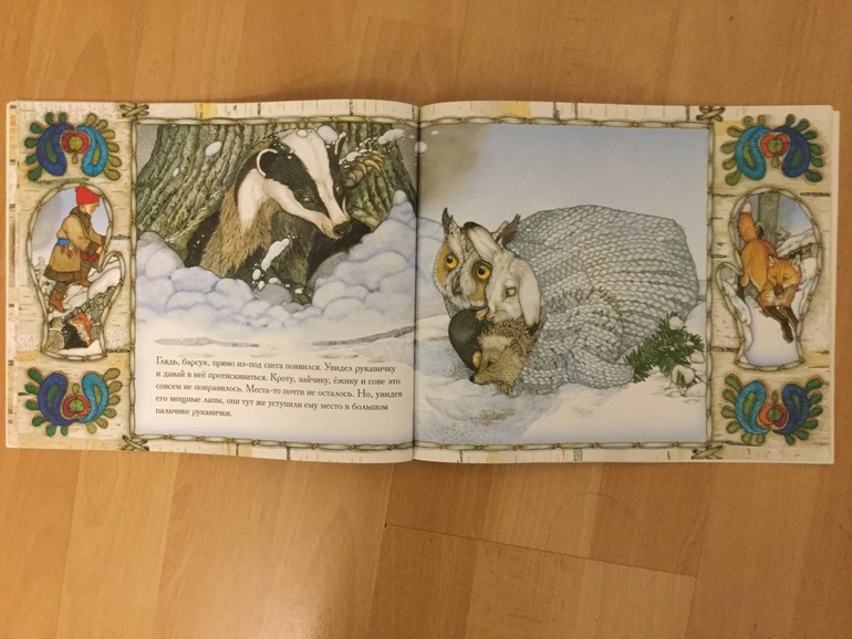 В заключении про книжку Джен Бретт Рукавичка. Это издание, конечно, очень очень красивое, но вот что-то мне кажется, что для ребёнка того возраста, для которого оно предназначается (а это около 2х лет) всё ж таки несколько слишком красивое - слишком много живописных деталей. Глаза разбегаются, но через несколько прочтений книжка была в целом освоена, хотя не могу сказать, что с большим интересом. Несколько разворотов:
