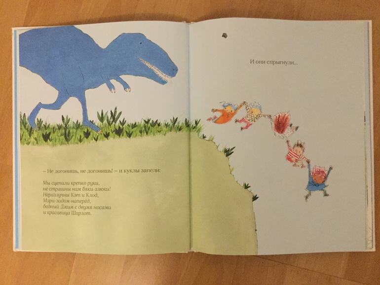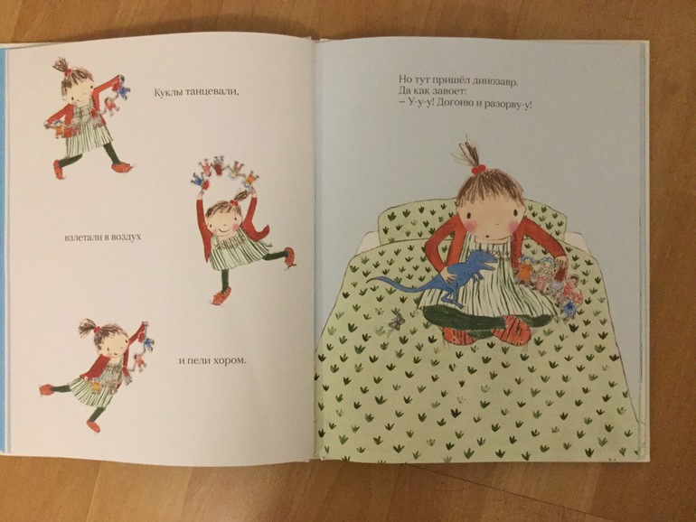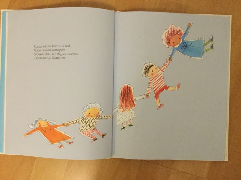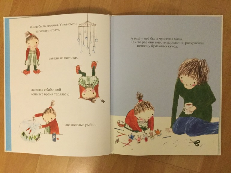 Бумажные куклы мне сразу очень понравились, как только я увидела развороты на Лабиринте. И ребёнок сразу очень оценил, приносила читать по нескольку раз в день! Мнения в семье же разделились - бабушка наша сначала сказала "какая чушь", а потом после многократных прочтений по просьбе внучки, через неделю уже сказала "ну неси уже Бумажные куклы почитать что ли, они мне вроде как даже уже нравятся". Папа наш сказал, что это трагическая история, что мальчик с ножницами - это ужасно, и что раз добрая бабушка попала в девочкину память, значит она умерла. Я не делала таких далекоидущих фатальных выводов, мне эта книжка кажется очень трогательной, милой и светлой, а главное понятной ребёнку. Я сразу читала её в абсолютно неадаптированном и не сокращённом виде. Несколько разворотов: