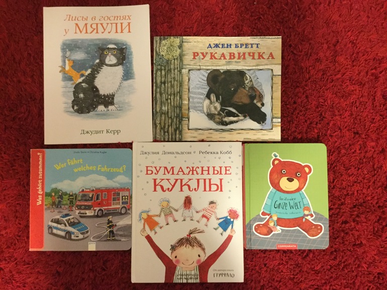 Любимых здесь две: Бумажные куклы и книжка с мишкой справа внизу, русский вариант называется "Мама, что это?".