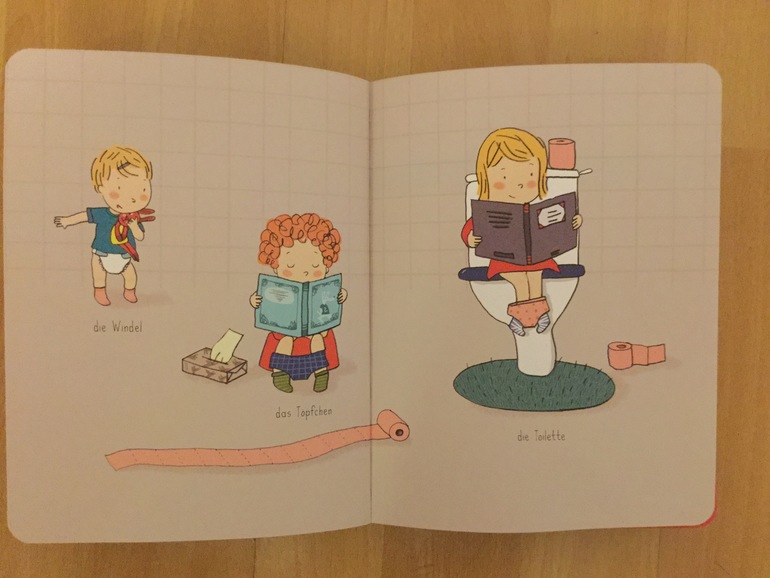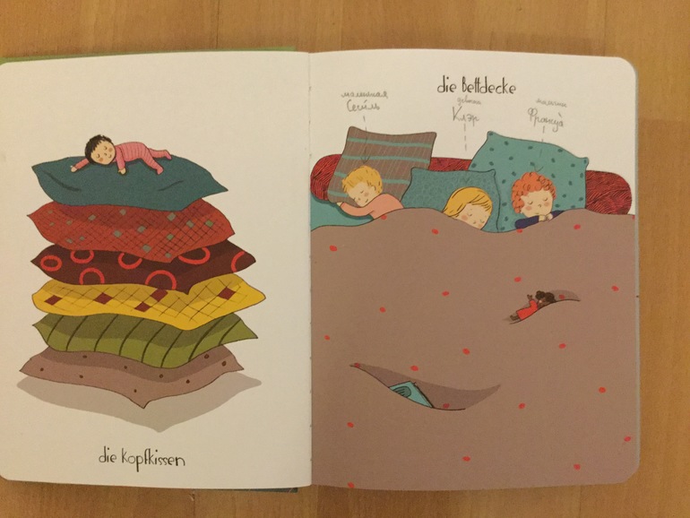 Теперь о "Мама, что это?". Кстати в немецком языке тоже считаю название неудачное ("Это весь мой мир"). Во-первых книжка толстенькая! Во-вторых книжка очень французская - я, как человек, который прожил во Франции около 6 лет, очень много деталей замечаю именно французских - это именно обычаи и привычки французской семьи, их день. Начиная с типичного французского завтрака - тосты со сливочным маслом и мармеладом, разворот, где папа с сыном готовят шоколадный пирог - это типичный шоколадный семейный пирог, который готовят во Франции, салат на ужин, вид сырной тарелки с разнообразием сыров, и много разных других деталей. Но в целом книжка, конечно, международная, и очень интересная для ребёнка обилием ситуаций. Мы назвали всех трёх детей из книжки французскими именами, так легче про них рассказывать. Немного разворотов: