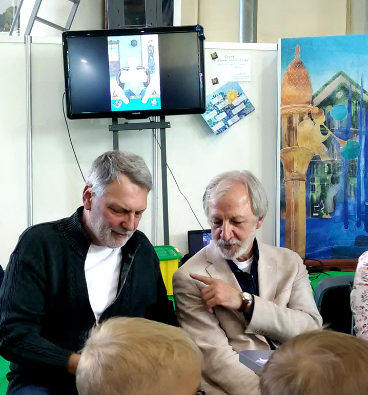 В субботу как-то стало спокойнее, свободнее. Авторы и художники радостно встречались и со своей публикой, и друг с другом. Вот Михаил Бычков и Игорь Олейников забежали ненадолго на начинавшуюся дискуссию: "Есть ли новое поколение детских писателей?"