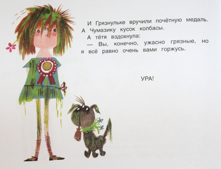 Чудесная, неунывающая девочка эта Грязнулька. Не даёт маме скучать, постоянно попадает в разные истории, в результате которых приходит домой вся чумазая. Да ей что бы замараться даже из дома выходить не надо, всё как-то само собой получается, даже если Грязнулька изо всех сил старается оставаться чистой.