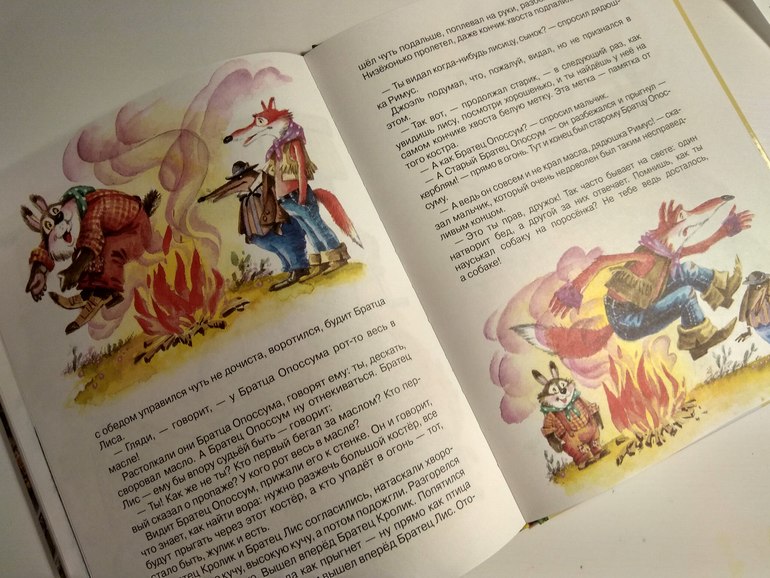 Помните нашу сказку про то, как лиса съела общественное масло и свалила всё на бедного, ничего не подозревающего медведя? Эта история, только в негритянской обработке, есть и здесь. Вот только в нашей лису всё же вывели на чистую воду и она поплатилась за свои бессовестные наветы. А что тут? Нечистый на лапу (или на что там ещё) Братец Кролик сбросил, как говорит Соня, свои грехи на кристально чистого Братца Опоссума. А тот, почувствовав себя прижатым к стенке, вдруг предложил развести костёр и прыгать всем через него. Кто не сможет, тот и виноват. Ёкарный бабай! И это предлагает опоссум, который и прыгать-то сроду не умеет... Ну и сгорел он начисто в этом костре. И где мораль? Какая? И логика?