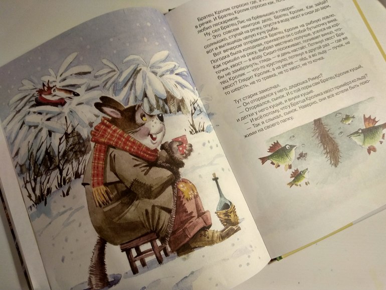 Ещё одна история, похожая на нашу, русскую народную. В нашей волк рыбу на хвост ловил, помните? Простачком он был, волк этот. Вот и поплатился. А лиса-то сколько пользы извлекла!.. Тут тоже была рыбалка. Подлёдная (откуда там прорубь, не знаю, ну да Бог с ним). А отправился на неё Братец Кролик. Но этот был не так прост! Знаете, что он с собой прихватил? Бутылочку водки вина! В лучших традициях национальной негритянской рыбалки! Ну, и , конечно, расслабился, примёрз! Вот тут какая-никакая мораль есть, согласна! Да уж, чем раньше детям рассказать о вреде алкоголя (без хвоста можно остаться!), тем лучше.