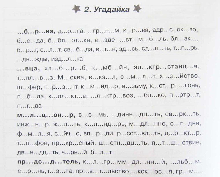 Задание 2. Угадайка. Группы по 20 слов выделены в абзацы. Необходимо угадать, что это за слова и вставить буквы (не только орфограммы)