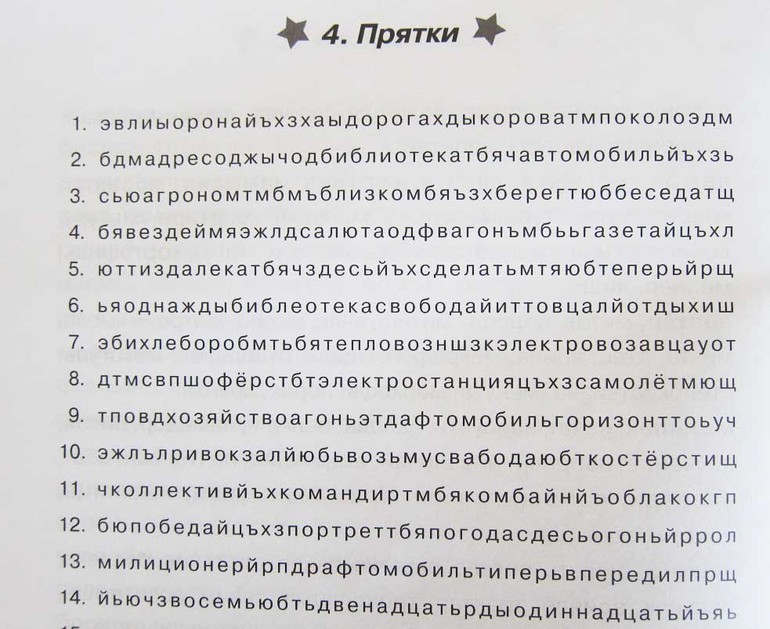 Задание 4. Прятки. О, какое чудесное задание! Найти в строке из букв слова. Найденные слова предлагается обвести в рамку.