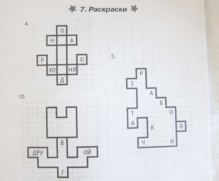 Задание 7. Раскраски или зашифрованный словарь. Из букв и слогов, размещенных внутри картинки необходимо составить как можно больше слов. Всего в пособии 30 таких фигур, расположенных не по порядку. Фигурки потом можно раскрасить.