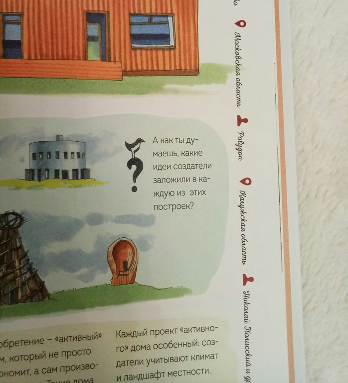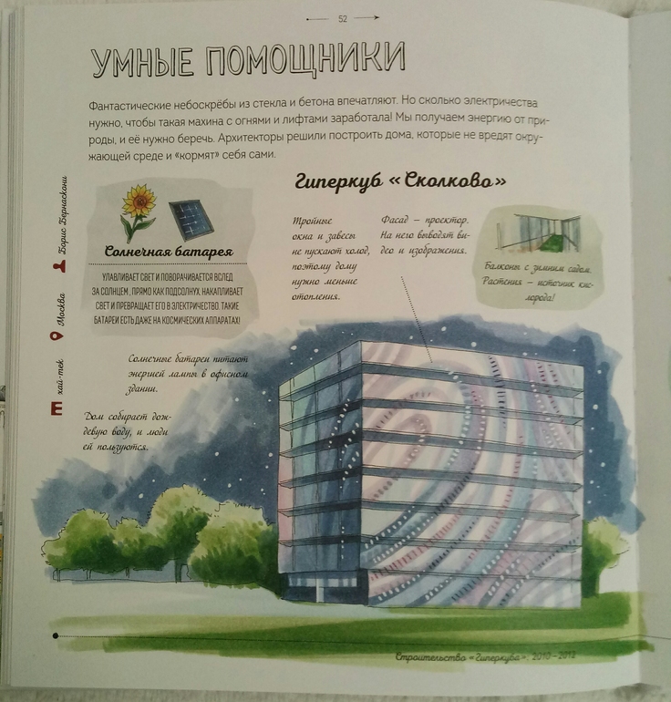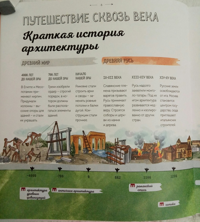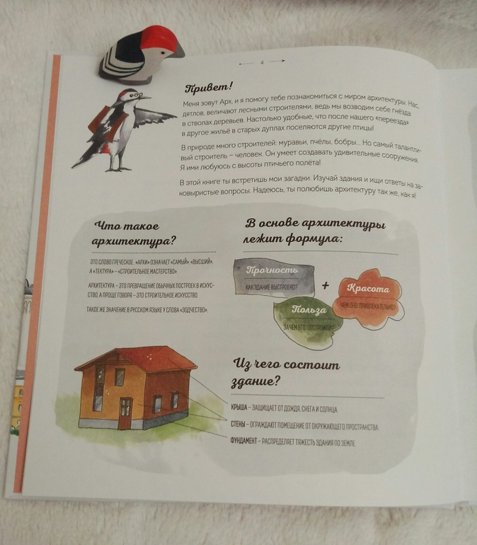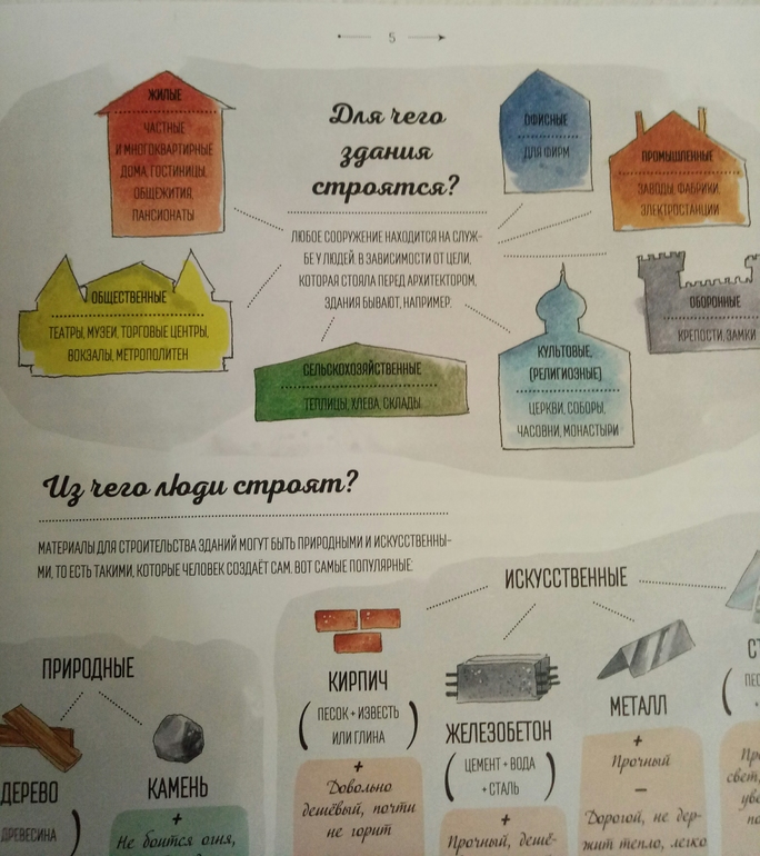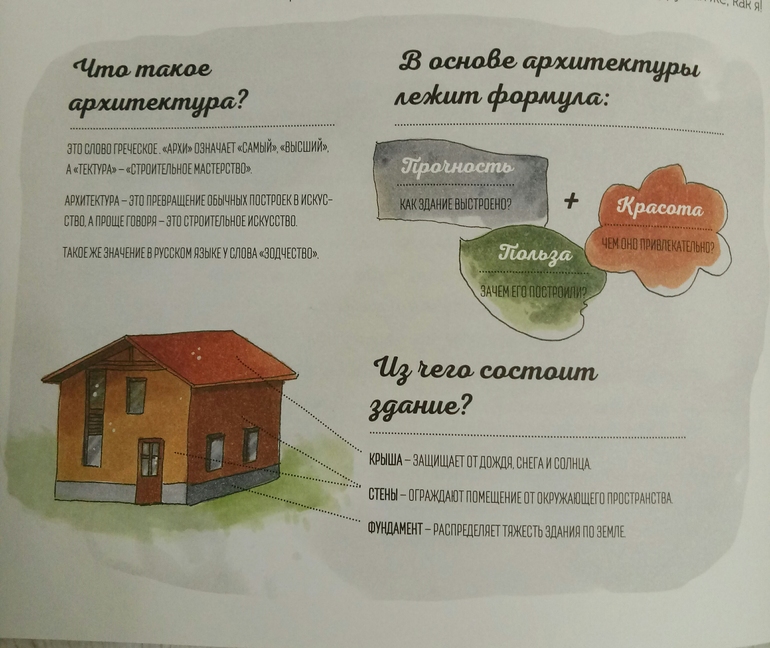 Книжка начинает не с места в карьер, для начала она освещает общие вопросы, что такое архитектура, для чего нужны здание, из чего они состоят, из чего строят,кратко и понятно расписаны плюсы и минусы используемых материалов. Есть что обсудить с ребенком!