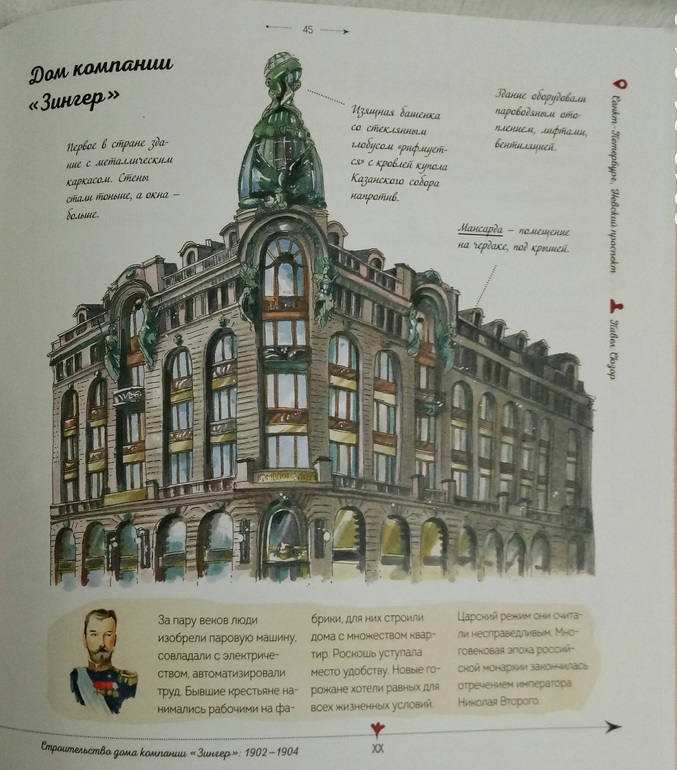 Интересна путешественникам, которые изучив ее захотят воочию увидеть Московский кремль, театр в Самаре, Казанский собор в Питере, он точно стоит того, чтобы на него посмотреть, или Дом Зингера, где, кстати, находится и Дом книги.