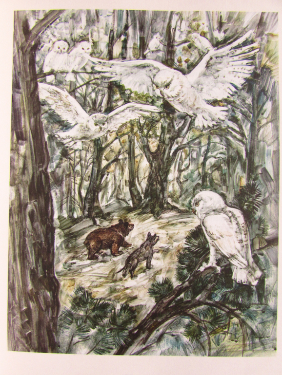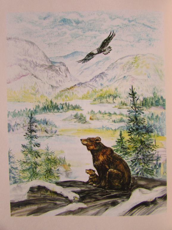 Этот медведь носит блестящий ошейник и бродит на свободе в обществе гигантского пса. Ни один охотник, встретившись с ним, и не подумает выстрелить в него. Впрочем, медведь этот стал таким большим и толстым, что разлюбил далекие странствования. А потому в этих местах действует неписаный закон, запрещающий ставить медвежьи капканы и ловушки ближе пяти миль от фактории. Дело в том, что больше чем на пять миль этот медведь в леса не углубляется. Когда же наступают холода, а с ними и время долгого сна, медведь забирается в глубокий уютный погреб, который вырыли для него под складом. И зимними ночами там же, привалившись к теплому боку друга, спит и пес Мики.