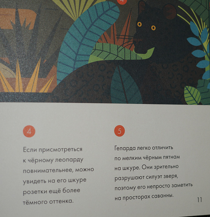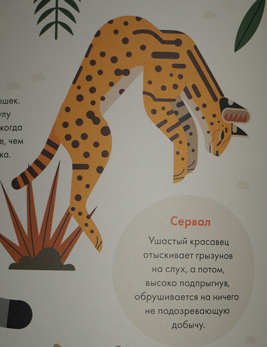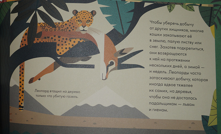 Дикие кошки - прирожденные мастера маскировки. В этом им помогает камуфляжная окраска, соответствующая местам обитания каждого конкретного животного. Замечательный разворот из книги великолепно иллюстрирует этот факт.
