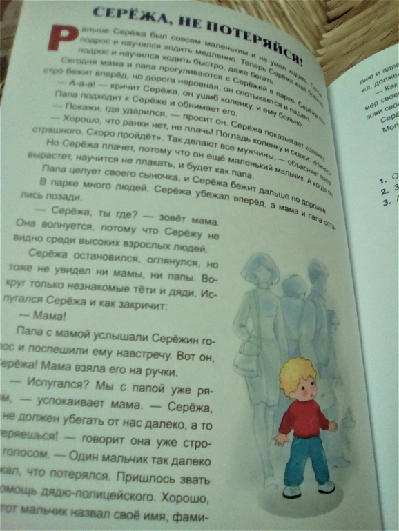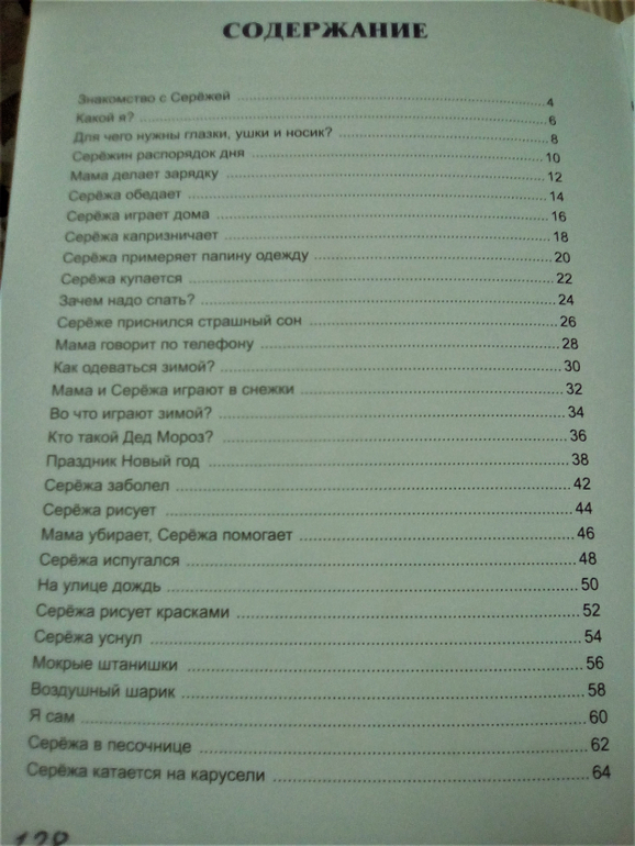 Потому что сын постоянно просит читать именно эту книгу, она даже Трёх поросят затмила. Даже если её спрятать под стопку других книг, он её откопает и принесёт. И ведь меня та мамочка, которая советовала рассказы про Серёжу, предупреждала, что придется их читать каждый день)). Абсолютно понимаю малышей, почему им так нравится читать про Серёжу. Нам, взрослым, тоже нравится читать то, что понятно и откликается, то, что написано доступным языком без обилия всяких абракадабр, за пониманием которых надо лезть в словарь. Так и в этой книжке. Много коротких рассказиков (фото содержания книги в конце поста) на страницу-полторы о том, как маленький Серёжа кушает, играет, гуляет, капризничает, помогает маме, ходит в гости к бабушке и т.д., и т.п., написаны понятно для малышей и полезны будут не только маленьким, но и их родителям.