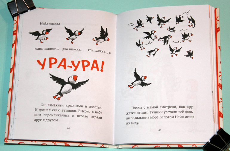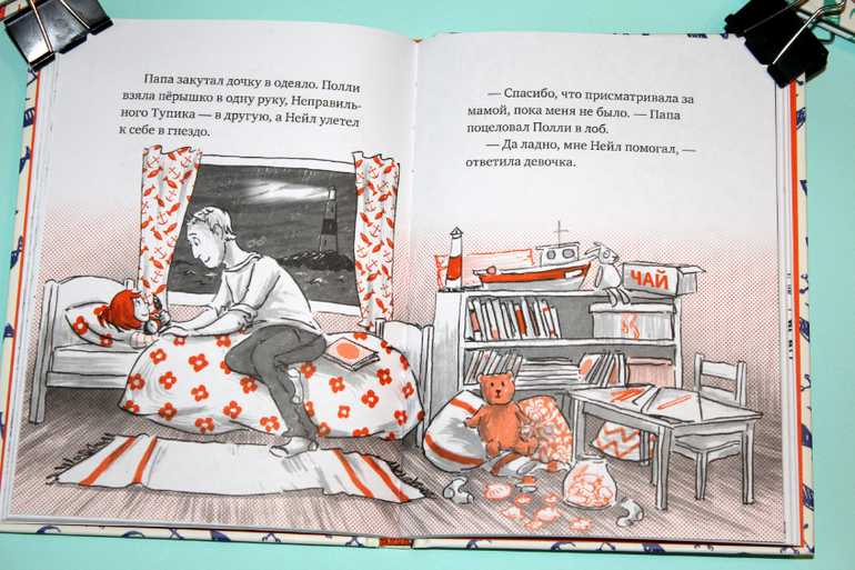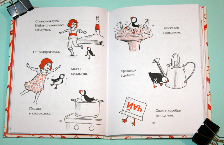 В первой книге девочка Полли знакомится с птичкой Тупиком. Он пострадал во время бури, и девочка лечит его, кормит, заботится. За время, пока птичка выздоравливала, они с Полли настолько сдружились, что не расставались ни на минуту. Как же им весело было вместе! Они кушали, играли, веселились, даже спали рядом, только Нейл спал в коробке из-под чая, рядом с кроватью Полли. И представляете, как трудно было им расставаться. Когда тупик улетел со своей стаей, Полли охватила тоска. Ничто не могло её порадовать, ни что не доставляло радости. А плюшевый тупик, которого подарила мама, только раздражал.