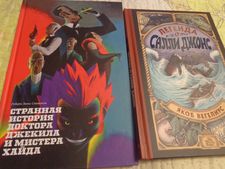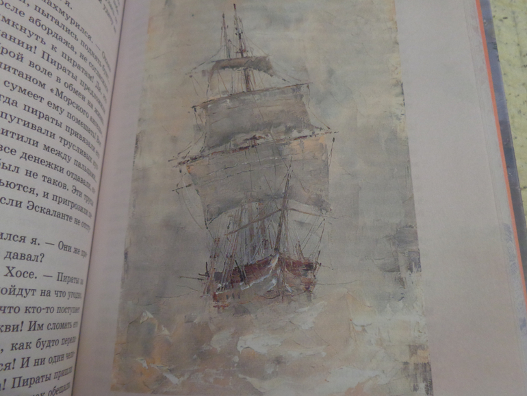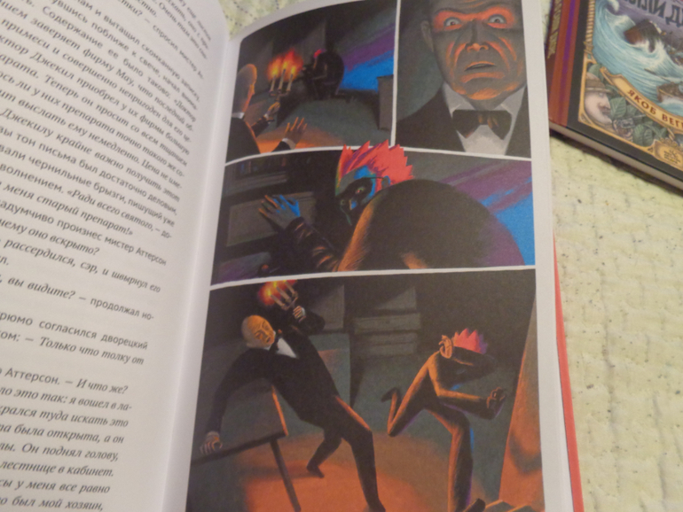давно отлеживалась в корзине, недавно подвернулась очень недорого, поэтому с радостью купила! Книга оказалась гораздо меньшего формата, чем я ожидала (может, сказалось невольное ожидание размеров книг как Григория Дикова этого же издательства?) Внутри очень неожиданные яркие, но темные иллюстрации в виде комиксов на текст автора Острова сокровищ: