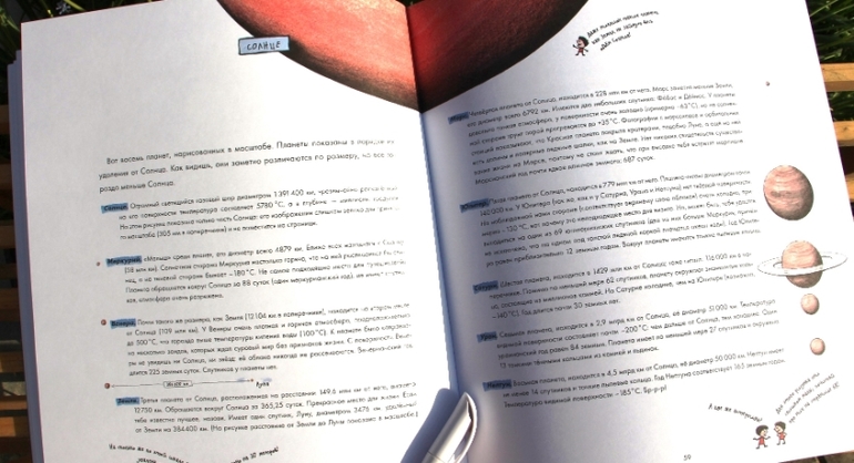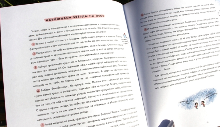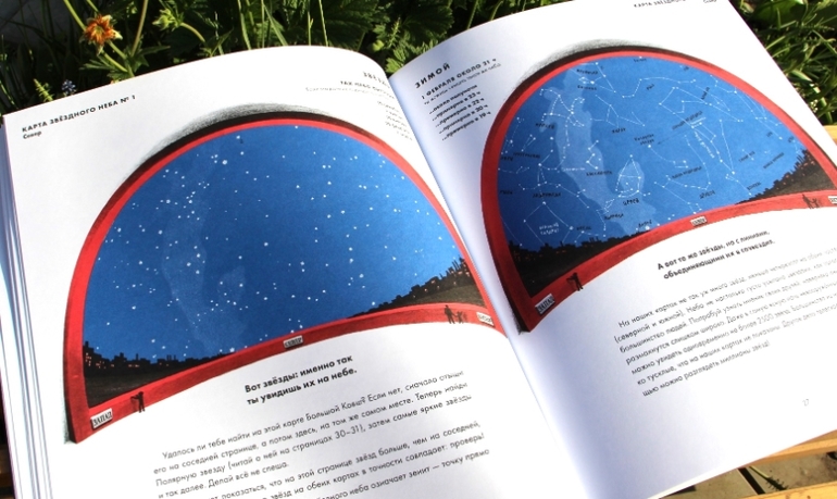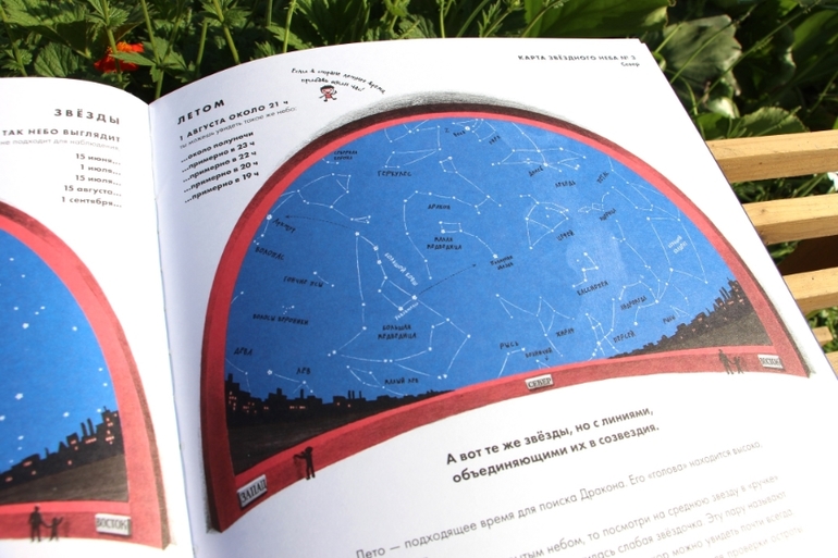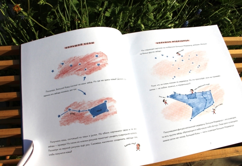 Книга интереснейшая! И не только про звезды. Помимо рисунков и описаний созвездий, звездных карт на каждое время года, она содержит еще кучу информации для общего развития. Очень интересно про измерение расстояния в световых годах и вообще про расстояние в космосе, как отличить на ночном небе планеты и звезды, про размеры планет, некоторые легенды, про зодиакальные созвездия. Тот факт, что карта звездного неба постоянно разная, никак не укладывается в детской голове.