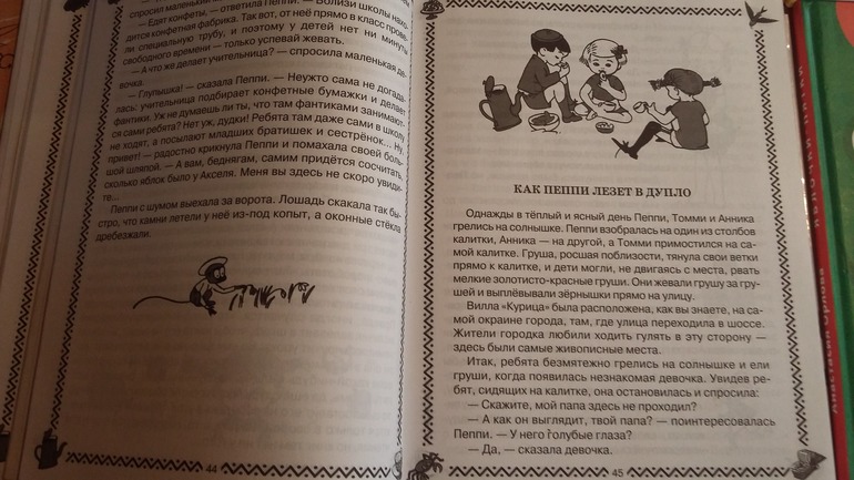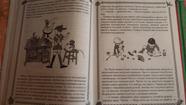Здесь на даче обнаружили толстенную книгу Астрид Линдгрен с черно- белыми иллюстрациями Ингрид Ванг Нюман, Илон Викланд. Варя - фанат шведского фильма про Пеппи Длинный чулок, и теперь мы читаем перед сном по рассказику из этой книги. Младшая - Арина узнает Пеппи на этих картинках, кричит - Пеппи, Пеппи (это единственный фильм, который она может сидеть и смотреть). Иллюстраций довольно много, практически на каждой странице есть маленькая зарисовочка.