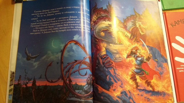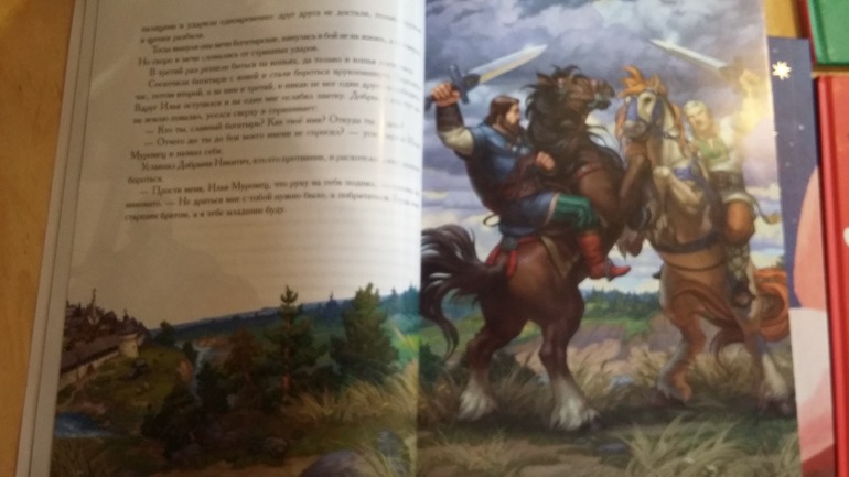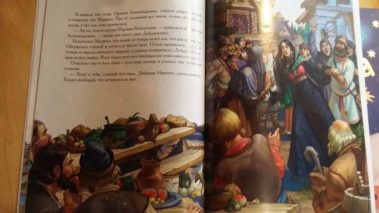 Книгу Былины Варя тоже нашла на даче и носит почитать. Я думаю, что на нее повлияли иллюстрации - рисунки Степана Гилева- яркие, сочные, четко выписанные все детали, лошади, богатыри, оружие. Она это все любит) В книге несколько историй про Добрыню Никитича в пересказе Сергея Удалина. Несложный слог, понятные слова. Пока читаем. Не знаю когда надоест, мне казалось что такие истории для деток постарше.