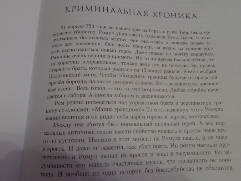 Суровые римские сказки - это легкий стёб во всем - в названии, в повествовании, в противостоянии текста и рисунков. Я вообще-то против упрощения текста и перехода на уровень подростков для привлечения детей к чтению вообще, и для изучения такой сложной истории в частности. Но тут не устояла! Почитайте сканы, а я думаю, они не оставят вас равнодушными! Я с очень неожиданной стороны посмотрела на знакомые легенды и мне понравилось)