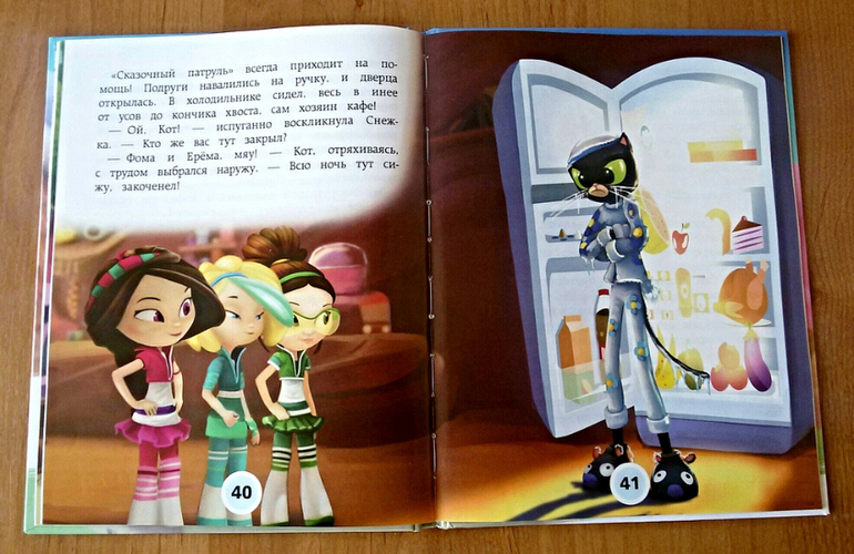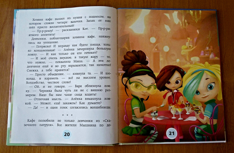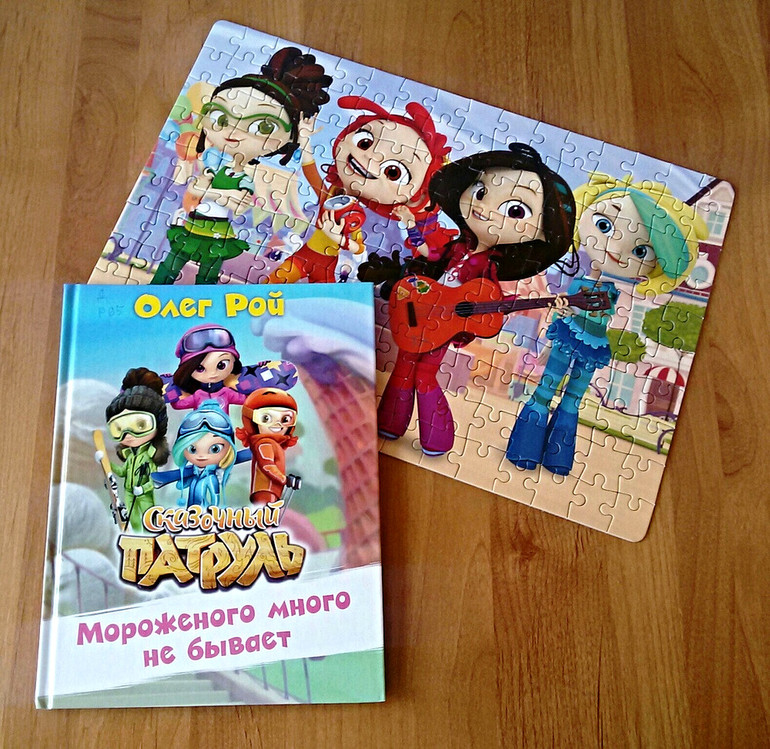 Дочка большая фанатка мультфильма про девочек из "Сказочного патруля". У нас есть куклы в виде главных персонажей, с которыми она играет. Также мы собираем пазлы с картинками из мультика. Дочка даже встала на скейт, чтобы быть как Аленка и у нее неплохо получается на нем кататься. А теперь мы добрались и до книг. Не знаю, есть ли серия про мороженое в мультике, я особо не отслеживаю, а в тех, что я смотрела, он мне не попадался.