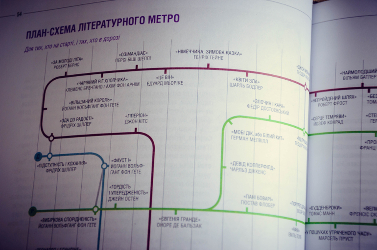 Схема литературного метро очень интересна. Указаны стили произведения - лирика, романы, иллюстрированные детские книжки..и направления - реализм, модернизм, литература после 1945..Если вам понравилось произведение примерно можно понять, куда двигаться дальше - какое произведение примерно в таком же духе.