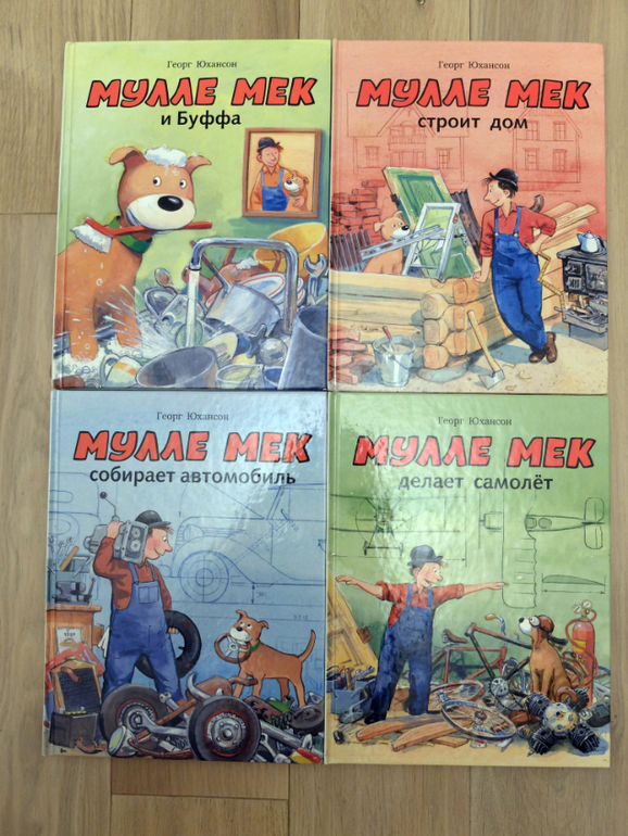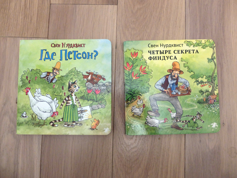 Две картонки и одна из "взрослых" книг про Петсона и Финдуса. Все три ОООООЧЕНЬ любимы. остальные большеформатные книги пока не пошли. В этой самый простой сюжет. Мама Му пока тоже без энтузиазма.