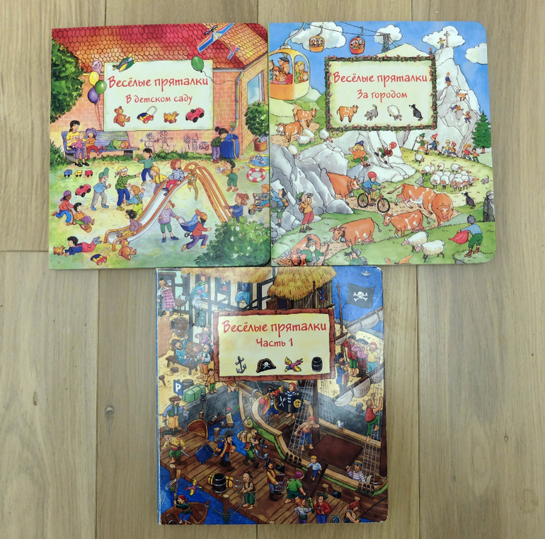 Далее вариации на тему виммельбухов. ОЧЕНЬ любимы три книжки из серии Веселых пряталок. Были там еще какие-то, кажется про деревню, но в принципе и этих хватает.