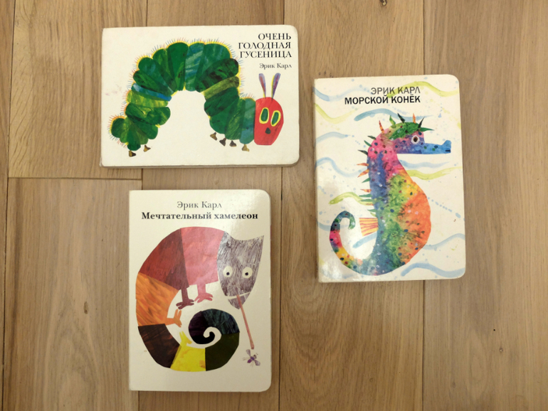 Эрик Карл. Ну... что сказать. Не хиты точно. От головы до пят я вообще убрала подальше-откровенно грубые картинки. Гусеница для дочки наиболее приемлемая, а сюжет о том, как зверь обрастал чужими крыльями-хвостами и прочими частями тела лучше посмотреть у Сутеева. В общем жалею, что купила Хамелеона и От головы до ног.