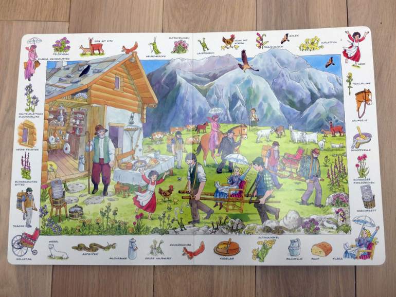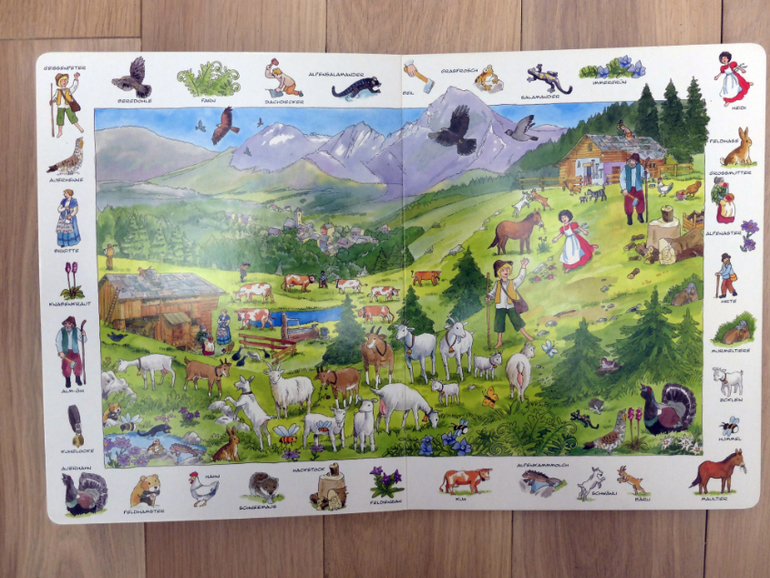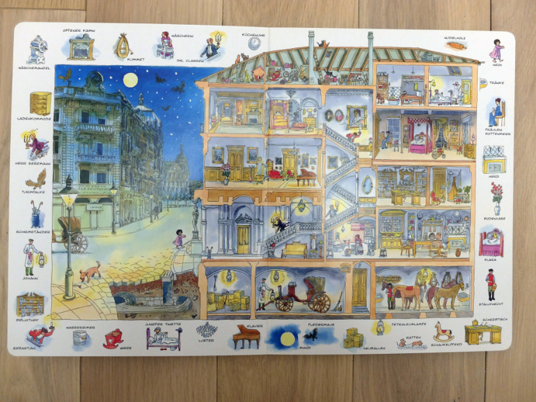 Еще один виммель, купленный на букинистическом развале в центре Вены за 3 евро. Специально не стала отдирать ценничек, он мне душу греет. Люблю книжку за то, что предметы для нахождения вынесены на поля, хотя сама графика не совсем по мне. Наверное для деток чуть постарше.