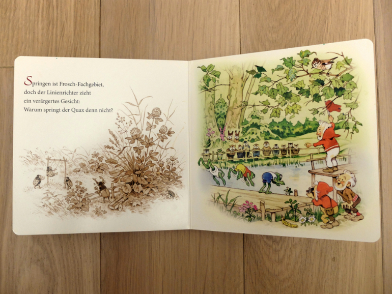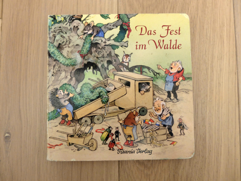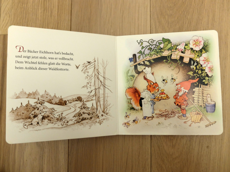 Еще одна замечательная немецкая книжка-картонка, обнаруженная с огромным удивлением в магазине игрушек в Голландии, с иллюстрациями Баумгартена. У меня есть полная немецкая коллекция с тонкой бумагой. Но пока не даю. В этом году меня ждало еще одно приятное событие. Моя подруга прислала мне адвент календарь с Баумгартеном. Мы с огромным удовольствием отрывали листочки до НГ. И еще у нас в ходу русская книжка "В стране гномов". Текст рассказываю от себя, каждый раз плюясь от качества иллюстраций. Надо ж было так испоганить картинки!