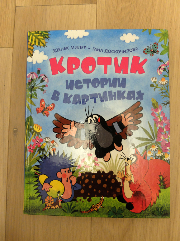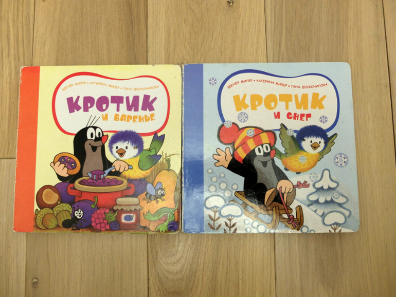Еще два хита. Картонки про Кротика. Остальные книжки из серии мне не понравились. Брать не стала. А эти до сих пор очень любим. Плюс сейчас с активном ходу толстая книга Кротик. Истории в картинках. Большие тексты я там пересказываю. Короткие читаю в оригинале.