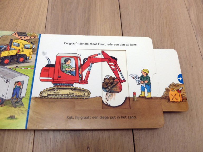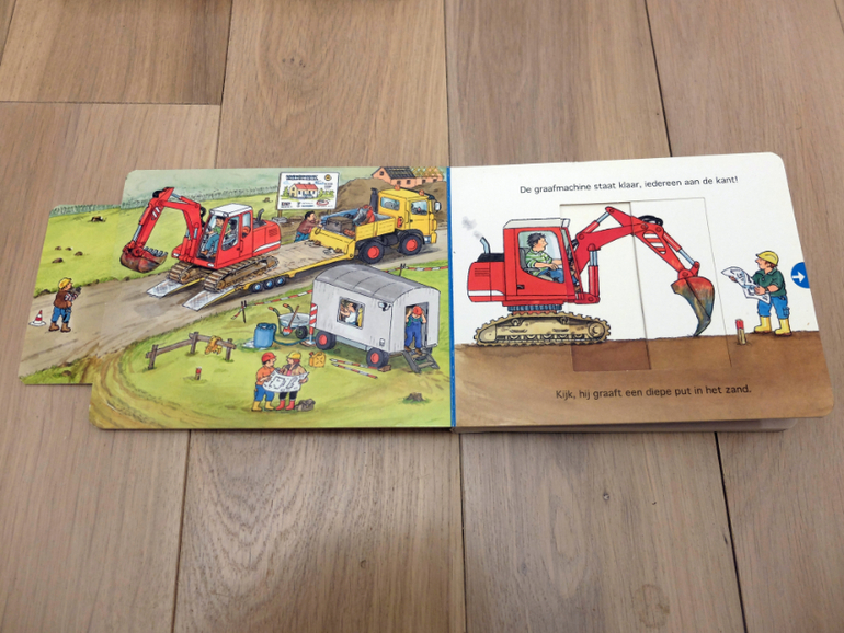 3. Книга "На стройплощадке" была привезена из Голландии. В принципе хорошая, дочка к технике в книжках достаточно равнодушна. Другое дело-на улице))) Покажу несколько разворотов у каждой.