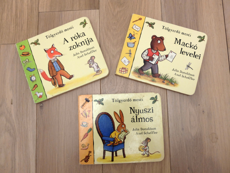 Следующая порция картонок приехала из Венгрии. Дональдсон и Шефлер с открывающимися окошками. Как ни странно у нас нет Груффало, и чего-то я не горю желанием его покупать. Все собираюсь. Пока соберусь, наверное, перерастем уже.