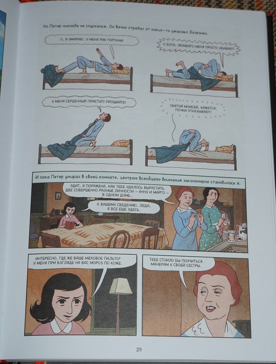 Вместе с Анной и её семьей в этом добровольном заточении оказалась еще одна еврейская семья и один одинокий еврейский доктор. Казалось бы, люди на краю гибели (или чудом спасшиеся от неё) должны быть вежливы друг с другом, предупредительны, учтивы и дружелюбны. Но, оказывается, люди остаются такими, какими они были изначально, от природы или от воспитания (причем как в хорошем, так и в плохом смысле) абсолютно в любых условиях! Некоторые из них позволяют себе бестактные поступки и высказывания.