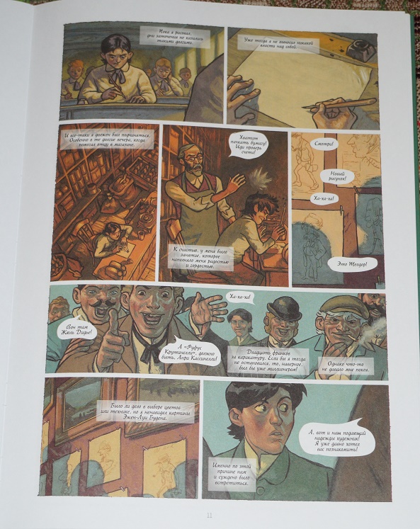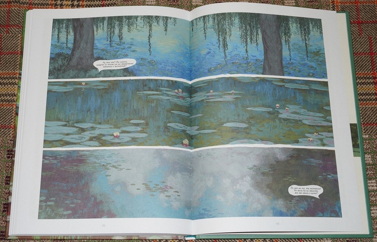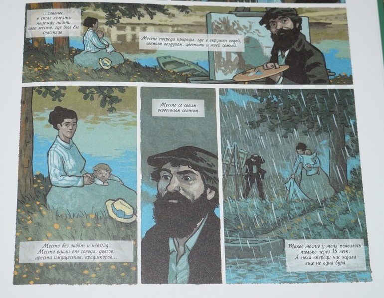 Невероятно сложной была судьба великого художника. Я думаю, всем поклонникам его искусства будет интересно прочитать и рассмотреть эту графическую биографию. Тем более, что на нескольких последних страницах книги (8 разворотов!) авторы (сценарист и иллюстратор) рассказывают о том, какие именно картины Моне стали фоном для этой истории в комиксах и почему именно они были выбраны для придания той или иной атмосферы сюжету.