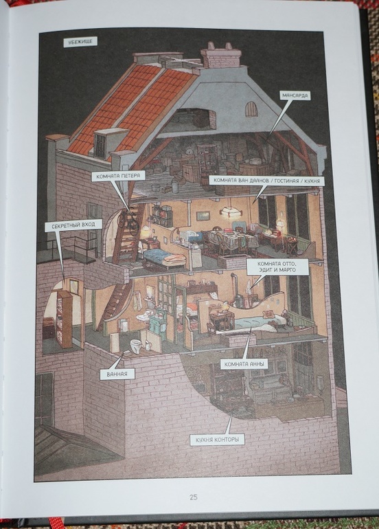 Довольно подробно в книге описан быт затворников, однообразная еда (через 15 месяцев совместного хозяйствования семьи решили разделить продукты и готовить порознь), их бесконечные разговоры (настолько известные всем из присутствующих рассказы, что по одной только первой фразе любой мог безошибочно распознать и продолжить историю) и споры (о поведении, плохом воспитании и прочее). А также мысли самой Анны (о сокровенном, очень личном и интимном), которые она поверяла только дневнику.