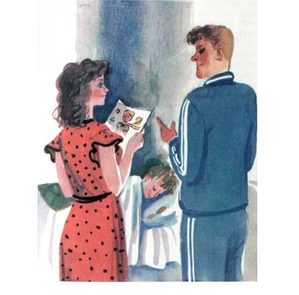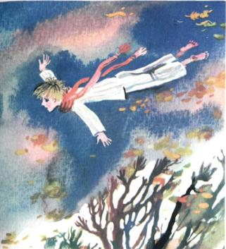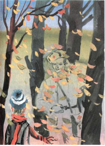 "Аллея закончилась. Впереди на площадке между вздыбленными глыбами горел огонь. Языки пламени высвечивали золотые буквы на полированных огромных каменных плитах. Мальчик протянул руки к огню. Огонь трепетал на ветру, будто шёлковый. - Здравствуй,- услышал Тимоша. Ему показалось, что это прошелестело из огня. - Здравствуйте! - ответил мальчик. Он нисколько не испугался, потому что голос был добрым и каким-то удивительно знакомым, точно Тимоша его уже много раз слышал.- А вы где? Кто вы? - Я твой дедушка. - Мой дедушка погиб на войне,- вздохнул Тимоша.- Обещал вернуться и не вернулся... - Раз солдат обещал, он своё обещание выполнит! Это точно...- сказал голос. - И я тоже вернулся. Только уходил живым, а вернулся... Вечным огнём. Памятником... И тут Тимоша сообразил, где находится. Ведь здесь, в центре города, у Вечного огня, Тимошу принимали в октябрята! Рядом с этими гранитными глыбами тогда он показался себе чуть больше муравья. - Да ты не сомневайся... Я действительно твой дедушка. Вон, прочитай. Огненный блик высветил среди других фамилий одну. - Наша! Наша фамилия. - А имя читай... - Ти-мо-фей. - Да... Тебя ведь в мою честь назвали. Ну что, поверил теперь? - А разве памятники разговаривают? - усомнился мальчик. - Памятники кричат. Только нам о пустяках говорить не положено. А у тебя, мне кажется, что-то стряслось. Верно, милый? - Откуда вы знаете? - прошептал мальчик. И он почувствовал, что глаза у него защипало. - Ну-ну! - сказал голос- Полно горевать-то. Давай поговорим. Сюда многие с бедой приходят. Помогает. - Я не могу,- вздохнул мальчик.- Я же вас не вижу. - А ты меня вспомни! Вспомни. Я ведь в памяти твоей живу... Пока ты меня помнишь, я и жив. Тимоша глянул в огонь и увидел, что там, по ту сторону огня, возникла знакомая фигура в ватнике, солдатских ботинках, в старой ушанке и широких штанах... Совсем как на фотографии над Тимошиной кроватью. - Не горюй только,- сказал солдат Тимоше.- Справимся с твоей бедой. Как думаешь? Главное - не унывать. - Да я ничего...- ответил мальчик.- Знаешь, я... летал... и... - Ну, так это у тебя наследственное.- В голосе солдата прозвучала даже гордость.- Я тоже летал. - Ты не думай, я без мотора... - И я без мотора. Какие моторы - сорок первый год! Враги знаешь как напирали! - вздохнул солдат, присаживаясь к огню.- Земля стонала, а вода горела. Меня тогда контузило. Крепко контузило! Я слух потерял. Вдруг слышу: с того берега реки, где наши оставались, меня раненые зовут. Кто шёпотом, а кто и совсем молча: «Санитара! Санитара...» Ну я к ним и полетел! - Значит... у тебя крылья выросли?.. Крылья? - Выходит, что так,- пожал плечами солдат.- Наверно. - Но ведь этого не может быть! - закричал Тимоша.- Люди по законам физики летать не могут... И крыльев у них нет... - Да я вроде - по законам-то физики, контуженный, да в грохоте, да под бомбёжкой - никак не мог услыхать наших ребят. Никак не мог, а ведь услыхал? - Да как же это может быть?.. Один раз на салюте рядом со мной пушка как выстрелила! Так я сразу оглох! И ничего не слышал. - И я, внучек, ничего не слышал. Я почувствовал. Сердцем услышал. У сердца свои законы! - Они что, не открытые ещё? - Как не открыты! Сколько люди на земле живут, столько и открытий. Каждый человек их для себя сам открыть должен. - А если не откроет? - спросил Тимоша. - Плохо его дело! - сказал солдат.- Не открыл, не постарался, не послушал своего сердца,- стало быть, зря на свете жизнь прожил! 