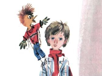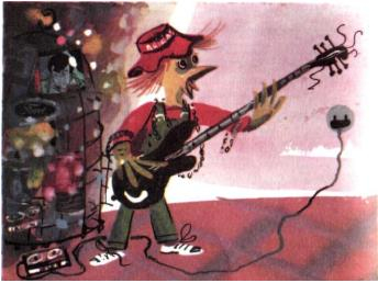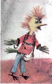 "На том, кто стоял на пороге клетки, были джинсы с таким количеством заклёпок, точно это были не штаны, а по крайней мере паровоз, и футболка с картинками и надписями, такими же, как на стенах клетки... Чего только на ней не было нарисовано: криворотые молодцы лупцевали друг друга босыми ногами, скалились зубастые тигры, наяривали на гитарах лихие певцы. А поверх всего шла густая надпись: MONTANA. Существо встряхнулось и зазвенело цепочками. Их на его груди и на штанах болталось столько, что с их помощью, пожалуй, можно было поставить на якоря весь торговый флот. Иван Карлыч, Тимоша и Будильник только рты разинули. Существо резво повело клювом, оглядело всех сбоку нахальным круглым глазом и уставилось на Ивана Карлыча. - Дед, продай очки! - Что?- растерялся Иван Карлыч. - Очки!- сказало существо и длинно сплюнуло, чуть не попав в циферблат Будильника..."
