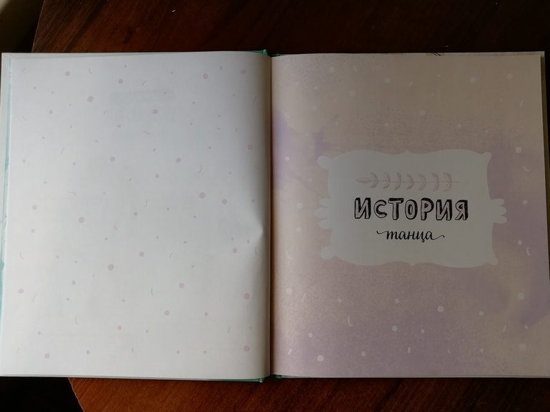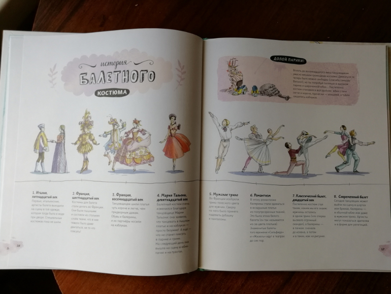 Первая часть знакомит нас с древними танцами, рассказывает какие виды танцев существовали и как появился балет. Отдельный разворот (если быть точной то полтора разворота) посвящен русскому балету, ребенок знакомится с именами наших известных балерин. Не забыли тут упомянуть и нашего Великого композитора- Петра Ильича Чайковского. Про балетные костюмы интересно рассказано, оказывается, раньше балерины танцевали в неудобных длинных платьях, париках и на каблуках.