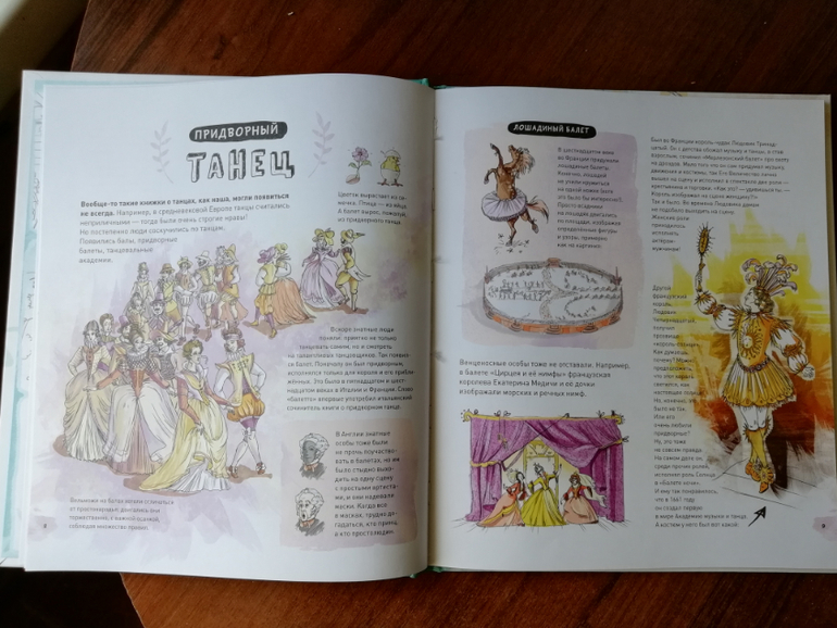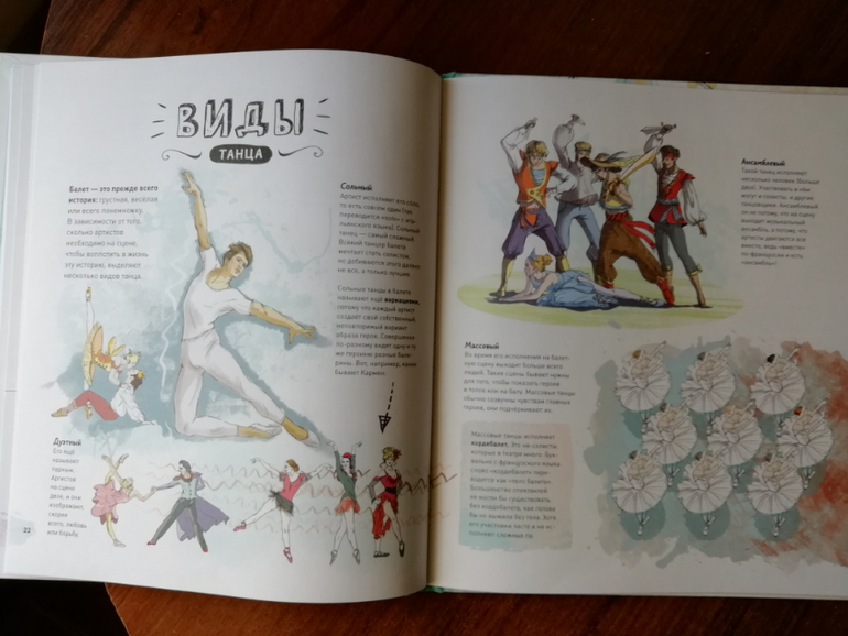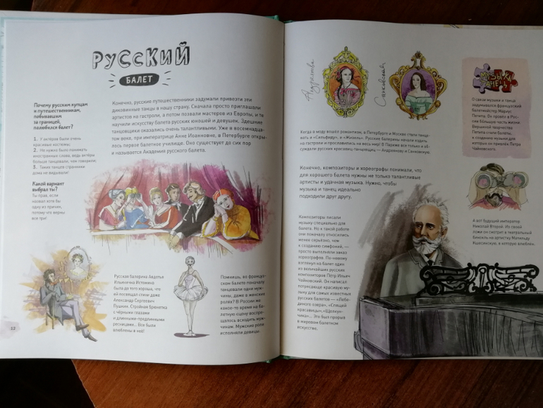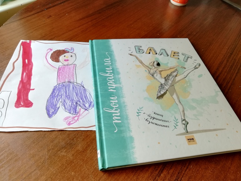 Сын сразу слился, когда мы сели читать про балерин, сказал, что у него такая про футбол есть и балет вообще девчачья тема. А мы замечательно провели время с дочкой вдвоем, читая "девчачью" энциклопедию, рисуя балерин, слушая музыку Чайковского, повторяя основные балетные позиции и смотря по интернету как танцуют настоящий балет!