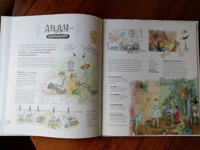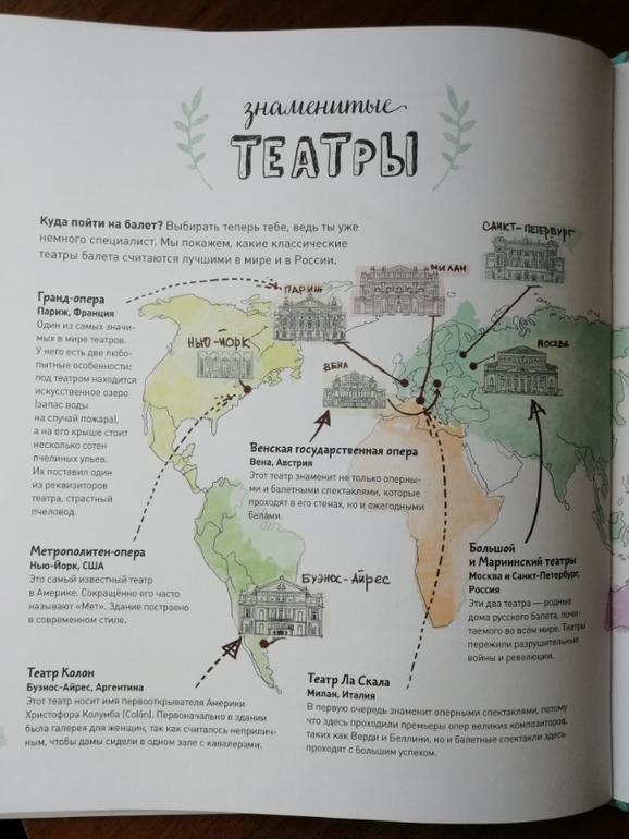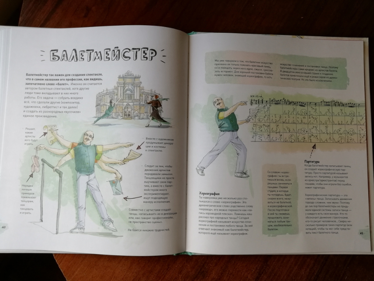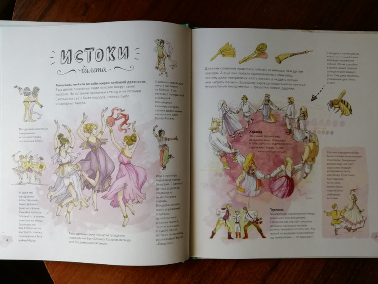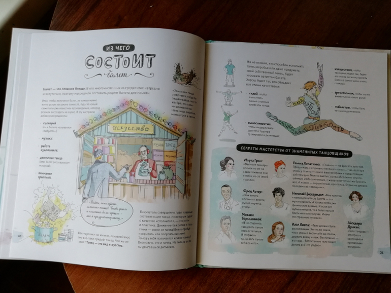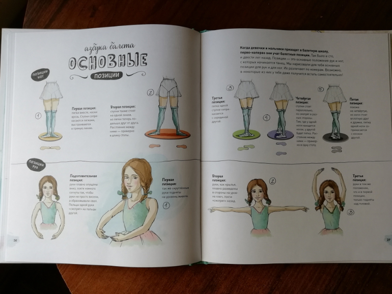 Второй раздел энциклопедии Балет, знакомит нас с составляющими балета и его видами, мы заглядываем на репетицию балерин и учимся выполнять основные позиции (теперь я тоже умею выполнять все основные позиции, нарисованные в книге, потому что пока я не повторила за Ксюшей, она от меня не отставала).