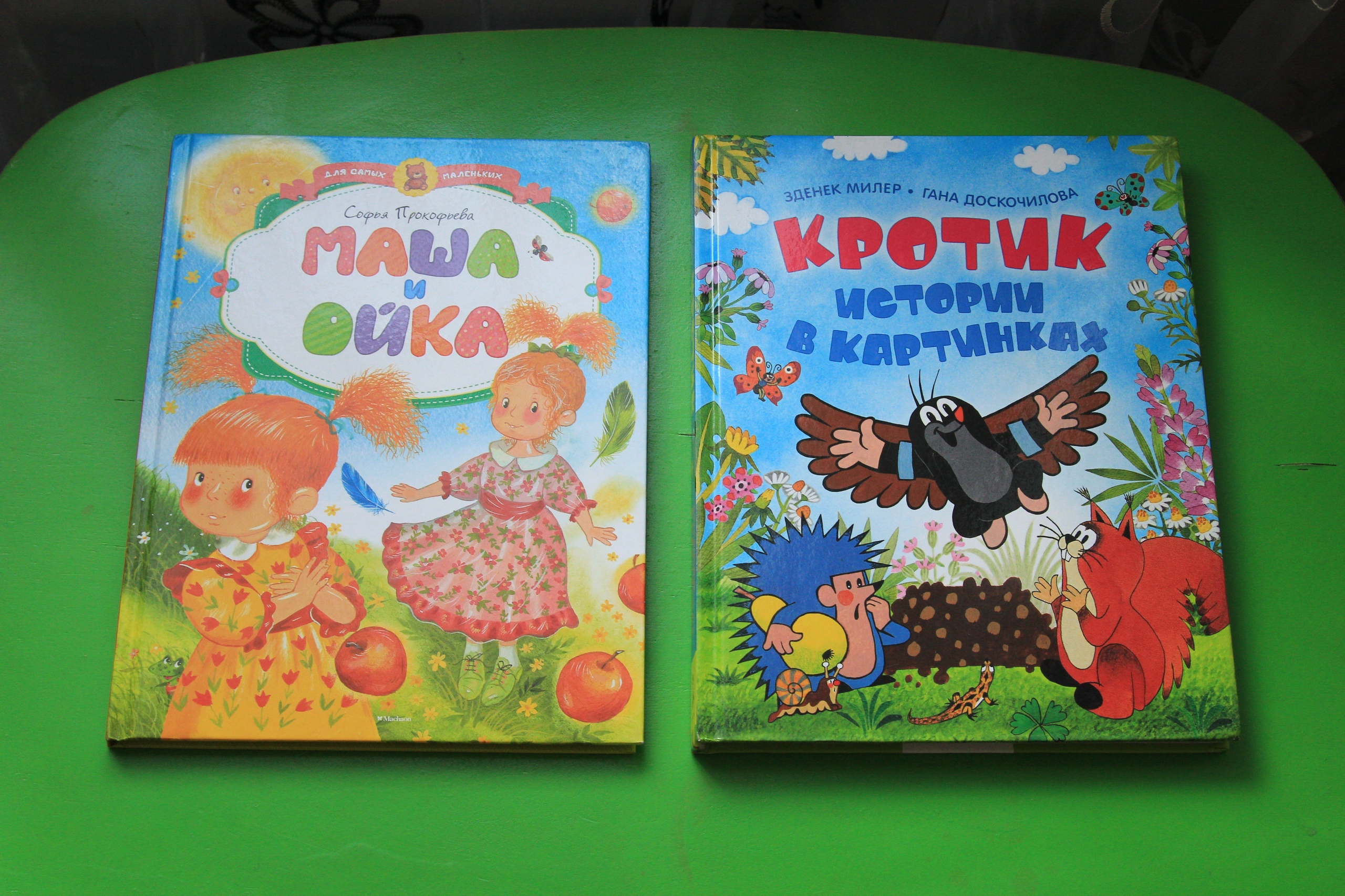 Маша и Ойка читалась фоном, пока сын кушал яблоко. В это время, я сама выбираю книгу и начинаю читать. А ему остается только слушать. А сам пока эту книгу ни разу не выбрал. Ничего, все еще впереди. Спрячу на пару месяцев и еще попробую.