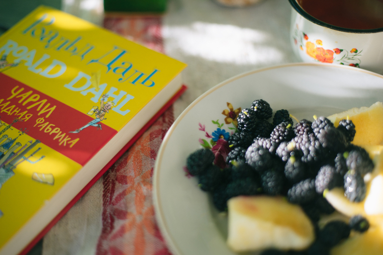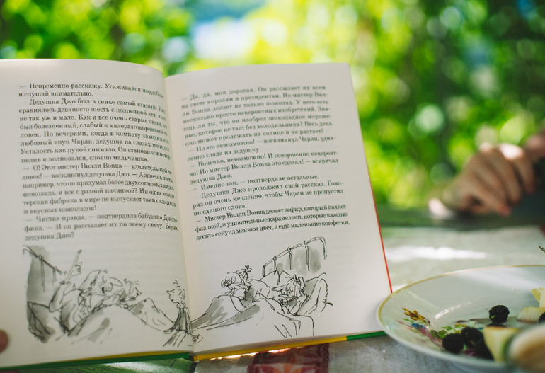 Я себе на лето покупаю Терри Пратчетта, а сыну Роальда Даля, очень мне хочется, чтобы они стали нашей летней традицией. Со страниц "Чарли и шоколадной фабрики" своевременно в необъятном жаре веяло холодом и сладостями, это как мороженое, быстро заканчивается, остановиться невозможно. Впервые я открыла книгу ещё в тот вечер давнего июня, когда мы после неспешной прогулки через центр города возвращались домой из пункта самовывоза. Рассказ четырнадцатилетнего переводчика меня покорил. Вот чудо, переводить с мамой и бабушкой полюбившуюся книгу, прочитанную в оригинале.. кажется у меня появилась новая мечта. Сын не выпускал книгу из рук, читал и сам, читал нам папа, читала я вслух. Осталость кино посмотреть.