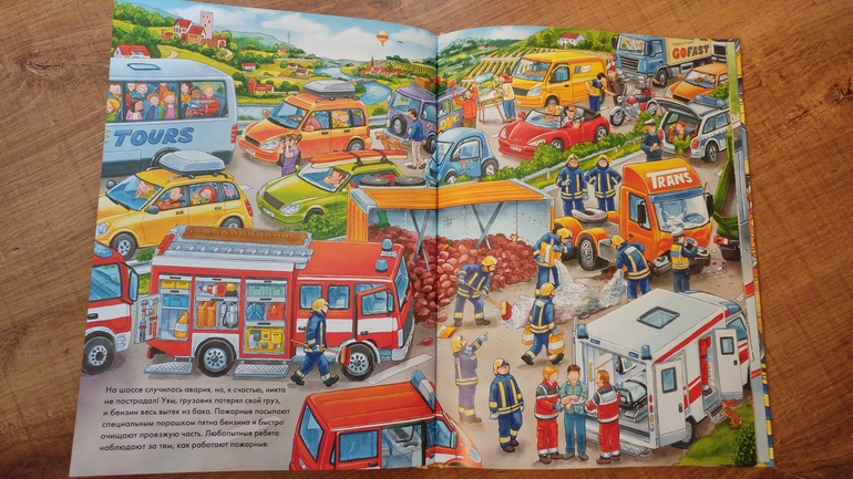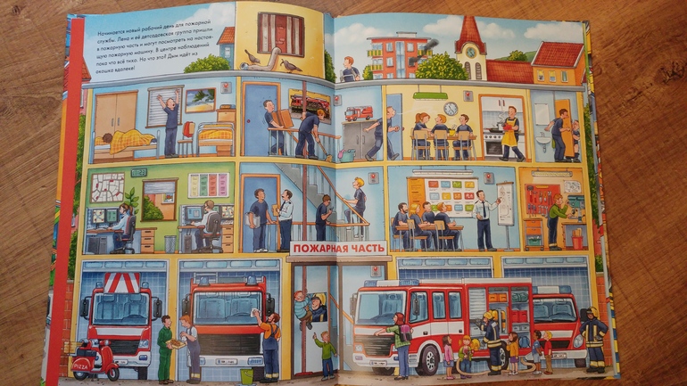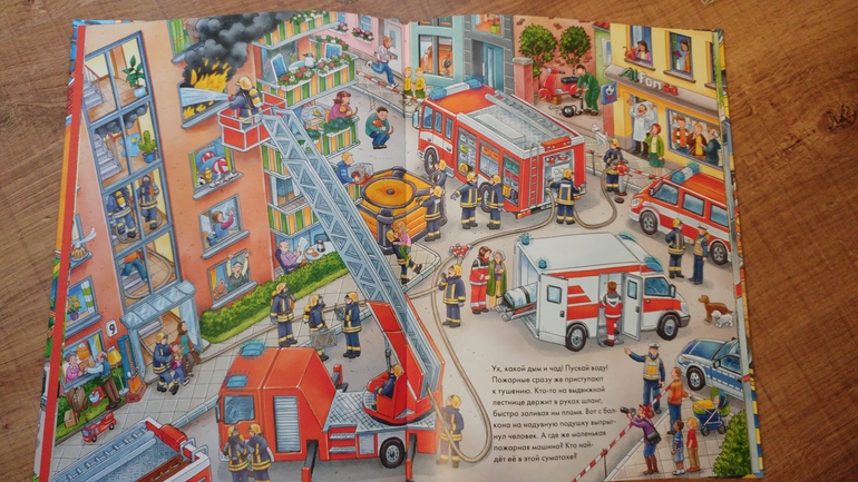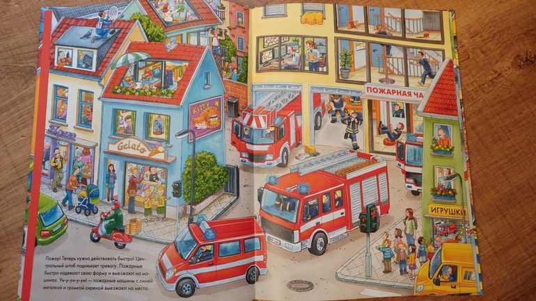 Где пожарная машинка? На каждом развароте смотрит что можете делать пожарная служба(тушить пожар, снимать котят с деревьев 😀, разбирать завалы на дорогах, устранять последствия аварии), ищет машинки, ищет и считает котов и птичек,рассказывает что происходит с героями