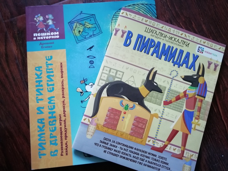 Книги с заданиями: Шпаргалки искалки в пирамидах и Тимка и Тинка в древнем Египте.