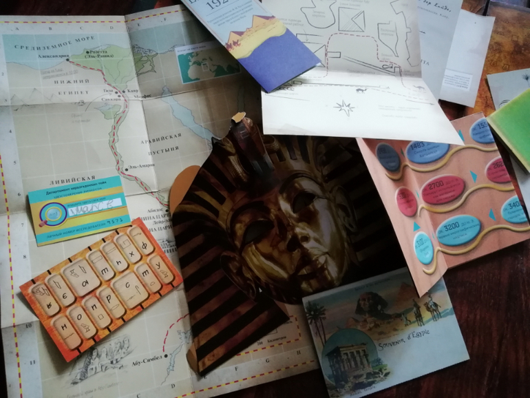 В конверте: маска фараона, конверт с походным набором, карта Египта, разные книжечки и открытки. Причем у каждого вложения есть свой номер, к ним мы будем обращаться по мере прохождения квеста из дневника.