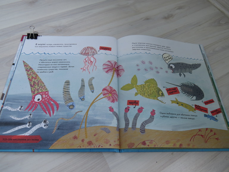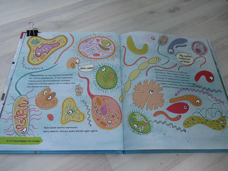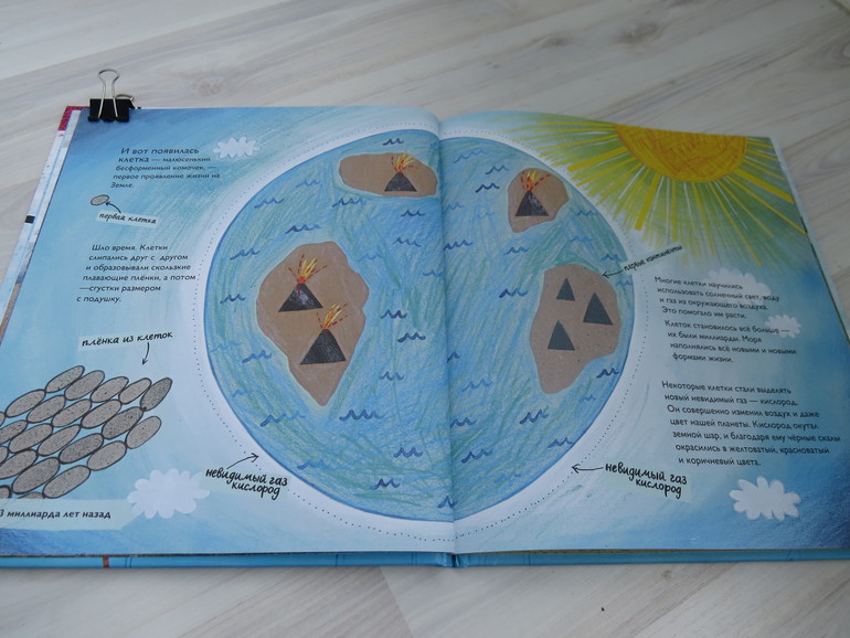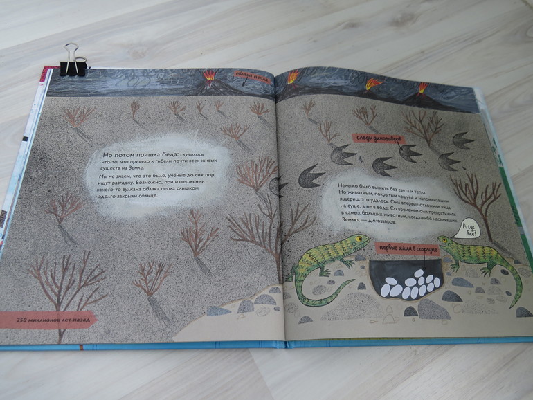 Доступным языком рассказывается история жизни от момента ее зарождения на земле до наших дней. Текста мало, немного обрывисто от периода к периоду, но для малышей вполне достаточно.