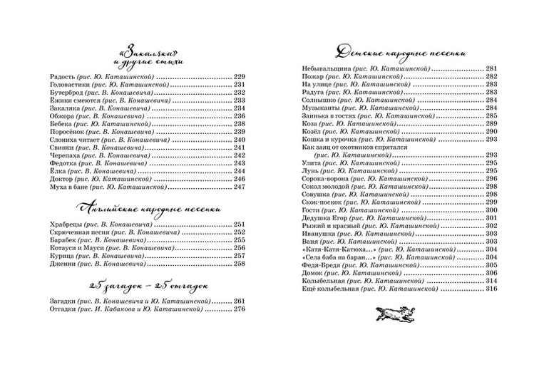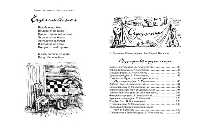 Любимые сказки, стихи и загадки классика детской литературы К.И. Чуковского, проиллюстрированные знаменитым художником Владимиром Конашевичем. Эти иллюстрации были сделаны для издания 1935 года. Интересно, что некоторые сказки в этом издании приводятся в старой редакции, и это даёт возможность проследить, как К.И. Чуковский работал над текстом.