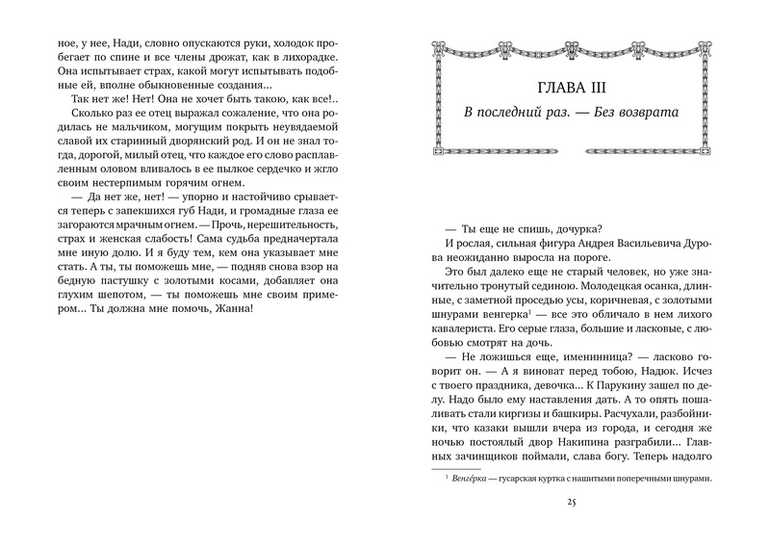«Смелая жизнь» - это удивительная история Надежды Андреевны Дуровой, первой в русской армии женщины-офицера, чья жизнь была полна невероятных приключений и испытаний. События повести разворачиваются на фоне Отечественной войны 1812 года. Переодевшись казачком, дочь гусарского ротмистра убежала из дому в действующую армию, принимала участие в сражениях и за проявленную храбрость была награждена солдатским Георгиевским крестом. Когда обман раскрылся, покровителем Надежды Дуровой стал император Александр I, разрешивший ей остаться в армии. Она служила ординарцем у Кутузова и получила ранение при Бородине, а позднее вышла в отставку в чине штаб-ротмистра. В начале ХХ века личность «кавалерист-девицы» вызвала интерес писательницы Лидии Алексеевны Чарской. В книгу вошли иллюстрации к повести «Смелая жизнь» замечательного чешского художника Венцеслава Черны.